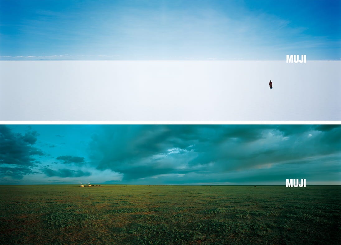 하라 켄야는 이러한 전통을 시각적 커뮤니케이션 요소로 활용하여 간결함과 절제를 통해 브랜드의 정체성을 표현했다. 고요한 하늘, 단순하면서도 끝없이 펼쳐질 것만 같은 지평선, 그리고 그 위에 서있는 한 명의 인물은 명징하면서도 명상적인 분위기를 동시에 자아낸다.